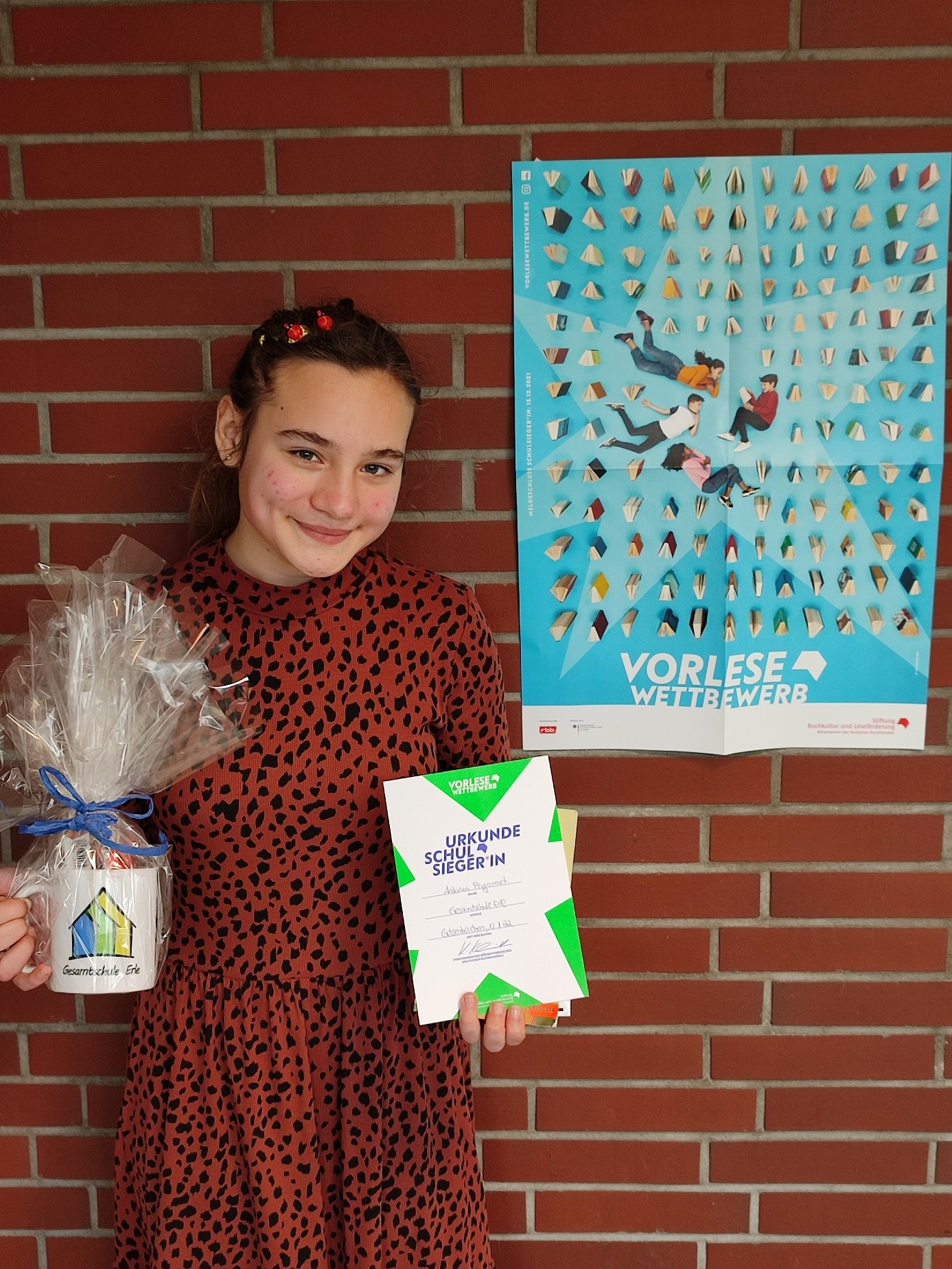 Antonia Prgomet ist die Gewinnerin des Vorlesewettbewerbs an der Gesamtschule Erle. Die Sechstklässlerin setzte sich im 63. bundesweit ausgetragenen Vorlesewettbewerb gegen insgesamt 148 Mitschüler*innen durch und qualifizierte sich damit für die nächste Runde des Wettbewerbs, den Stadtentscheid, welcher Ende Januar 2022 startet.