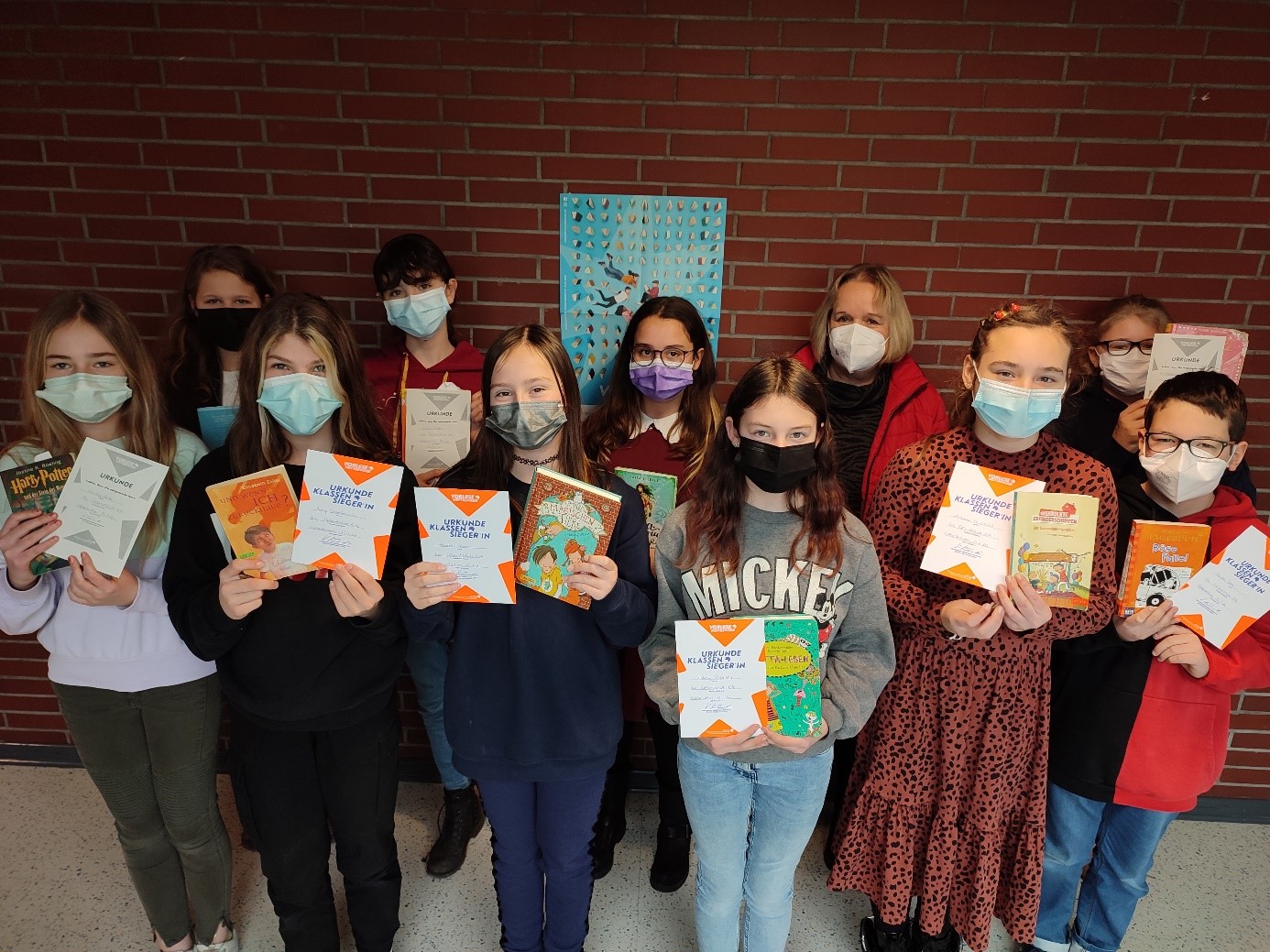 (Klassensieger*innen an der Gesamtschule mit der Abteilungsleiterin Beate Koch) (Schulsiegerin Antonia Prgomet)