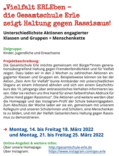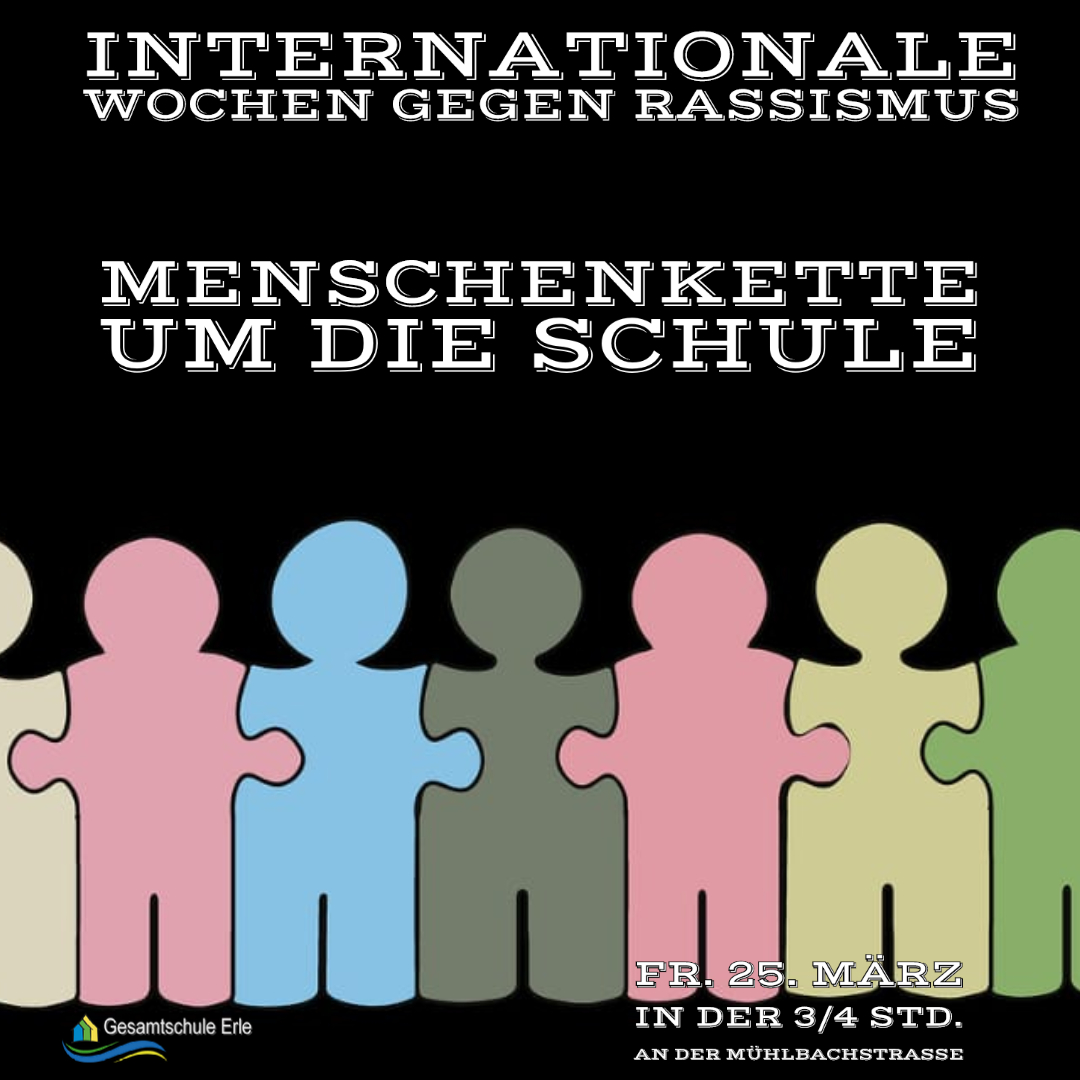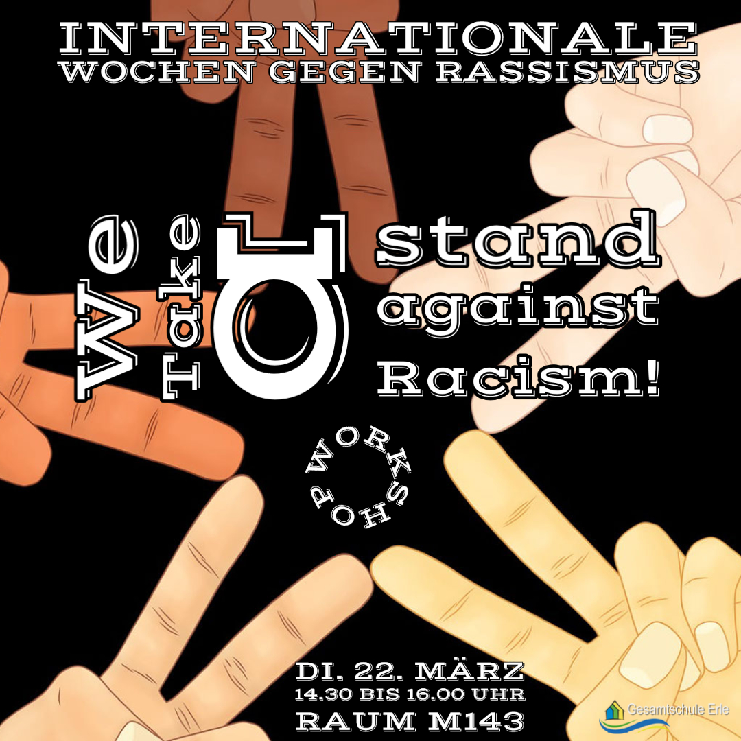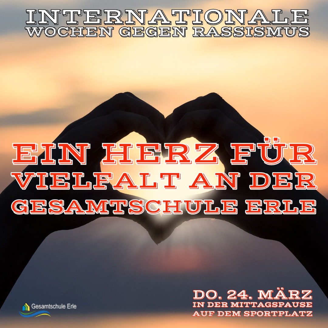 unter dem Motto „Haltung zeigen, friedlich & frei“ und mit der Forderung „Stop war“ finden in diesem Jahr die Internationalen Wochen gegen Rassismus vom 14. bis zum 27. März statt. Auch die Gesamtschule Erle informiert euch und beteiligt sich mit zahlreichen Aktionen.