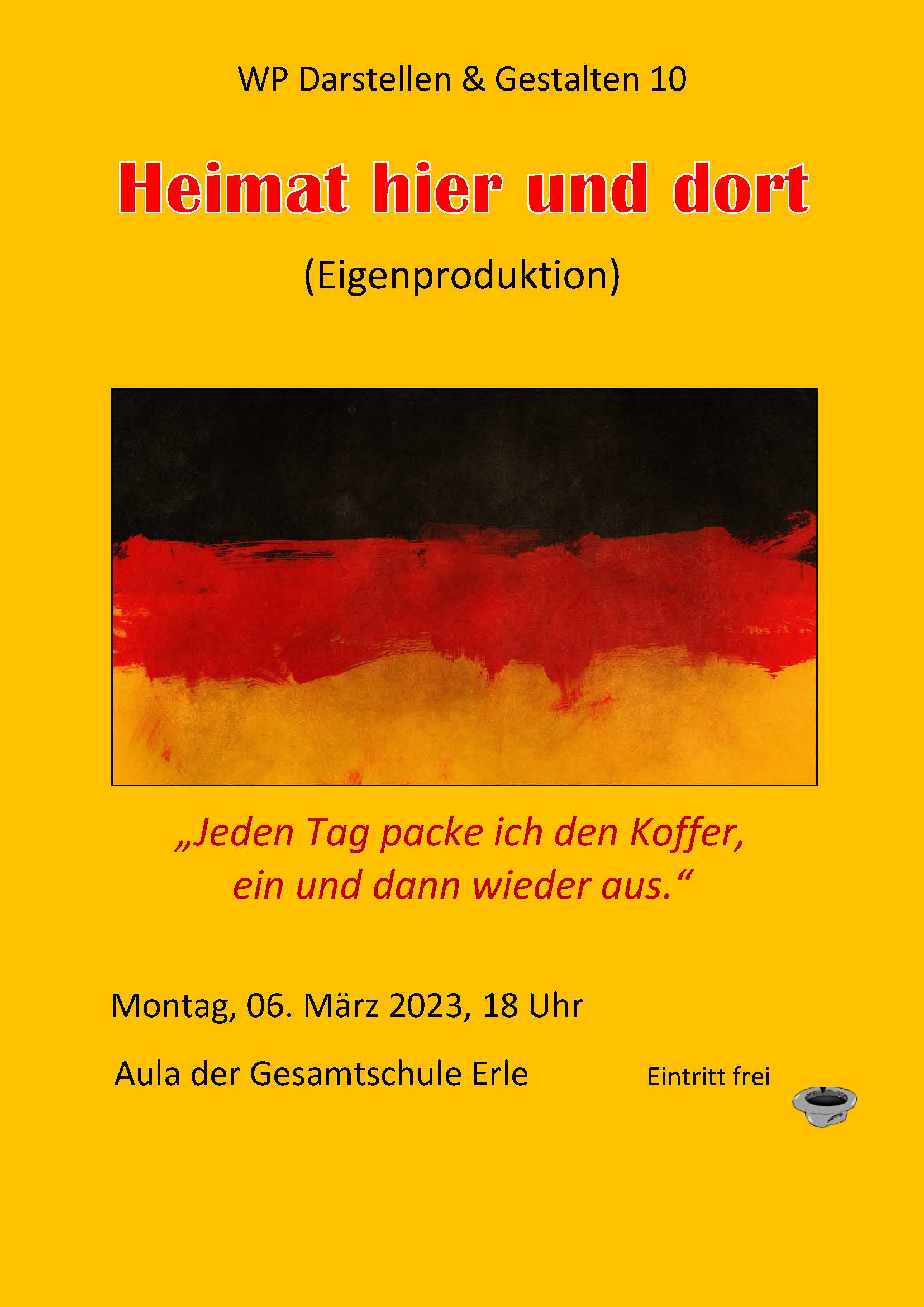 Der Kurs WP DG 10 hat eine Szenencollage zum Thema "Heimat hier und dort" entwickelt. Außerdem führten die Lernenden Interviews zum Thema mit verschiedenen Lehrerinnen und Lehrern, Schülerinnen und Schülern und Familienangehörigen, die sie im Anschluss an die Veranstaltung zeigen werden.