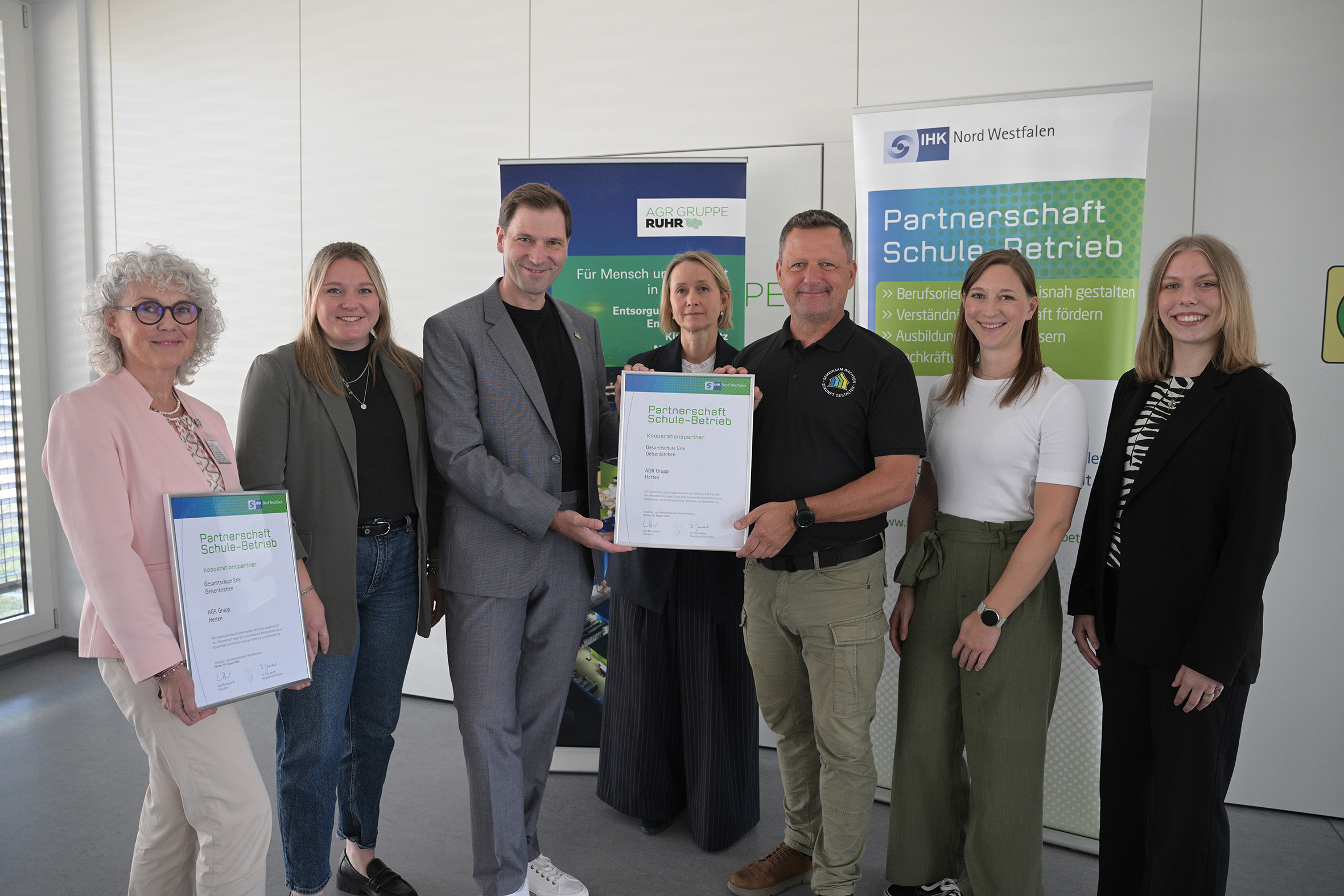 Foto/Bildzeile: Die Gesamtschule Erle in Gelsenkirchen und die Abfallentsorgungs-Gesellschaft Ruhrgebiet mbH (AGR) in Herten kooperieren im IHK-Projekt „Partnerschaft Schule-Betrieb“ (v.l.): IHK-Projektmitarbeiterin Eva Hild, AGR-Ausbildungsleiterin Lena Sasse, AGR-Geschäftsführer Marc Bunse, Studien- und Berufsorientierungslehrerin Larissa Borissov, Schulleiter Andreas Lisson, Studien- und Berufsorientierungslehrerin Lydia Nowak sowie IHK-Auszubildende Lilly Barthel. Foto: Pöhnert/IHK Nord Westfalen Industrie- und Handelskammer Nord Westfalen Sitz Münster mit Standorten in Bocholt und Gelsenkirchen Region: Kreisfreie Städte Bottrop, Gelsenkirchen, Münster und Kreise Borken, Coesfeld, Recklinghausen, Steinfurt, Warendorf