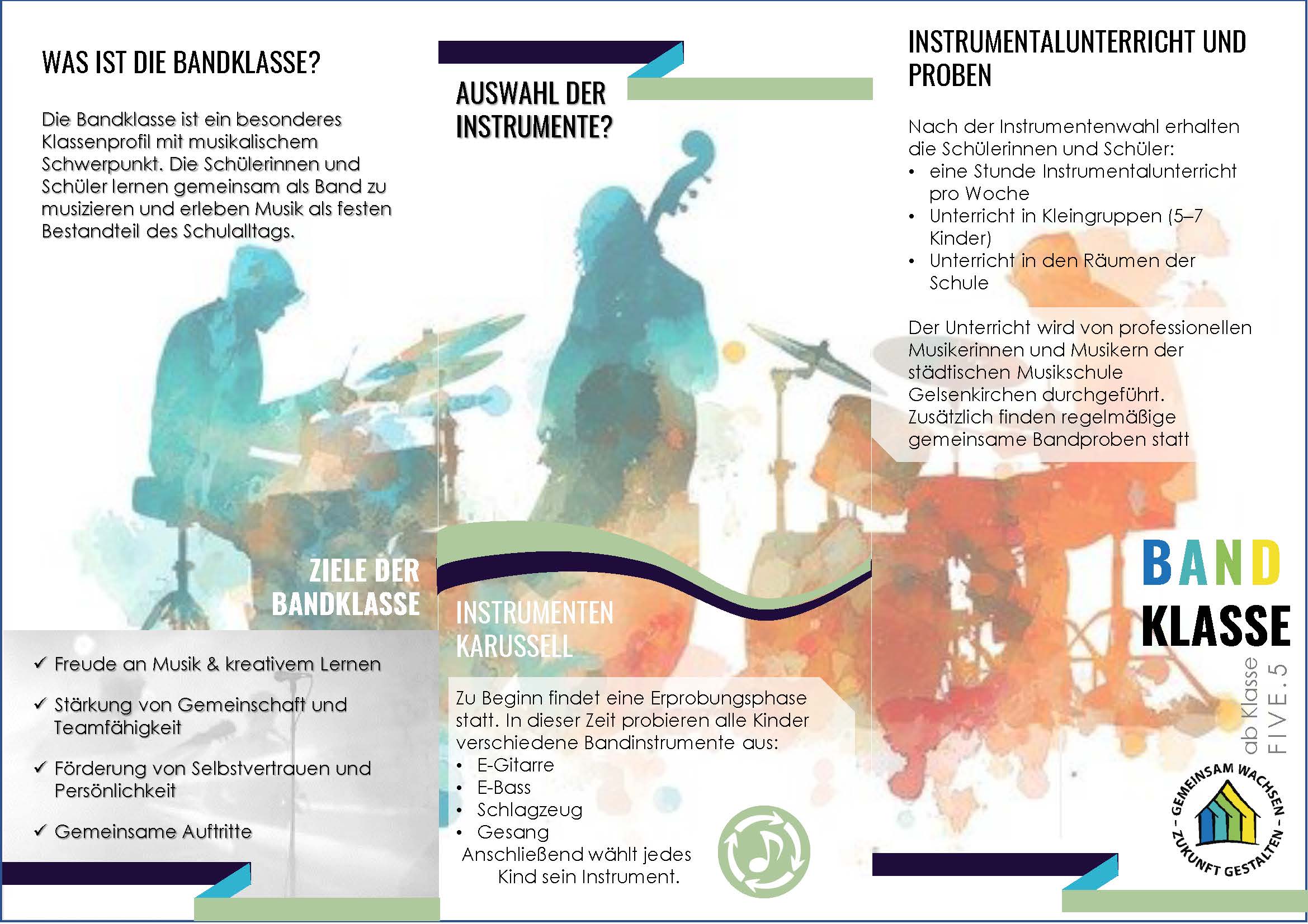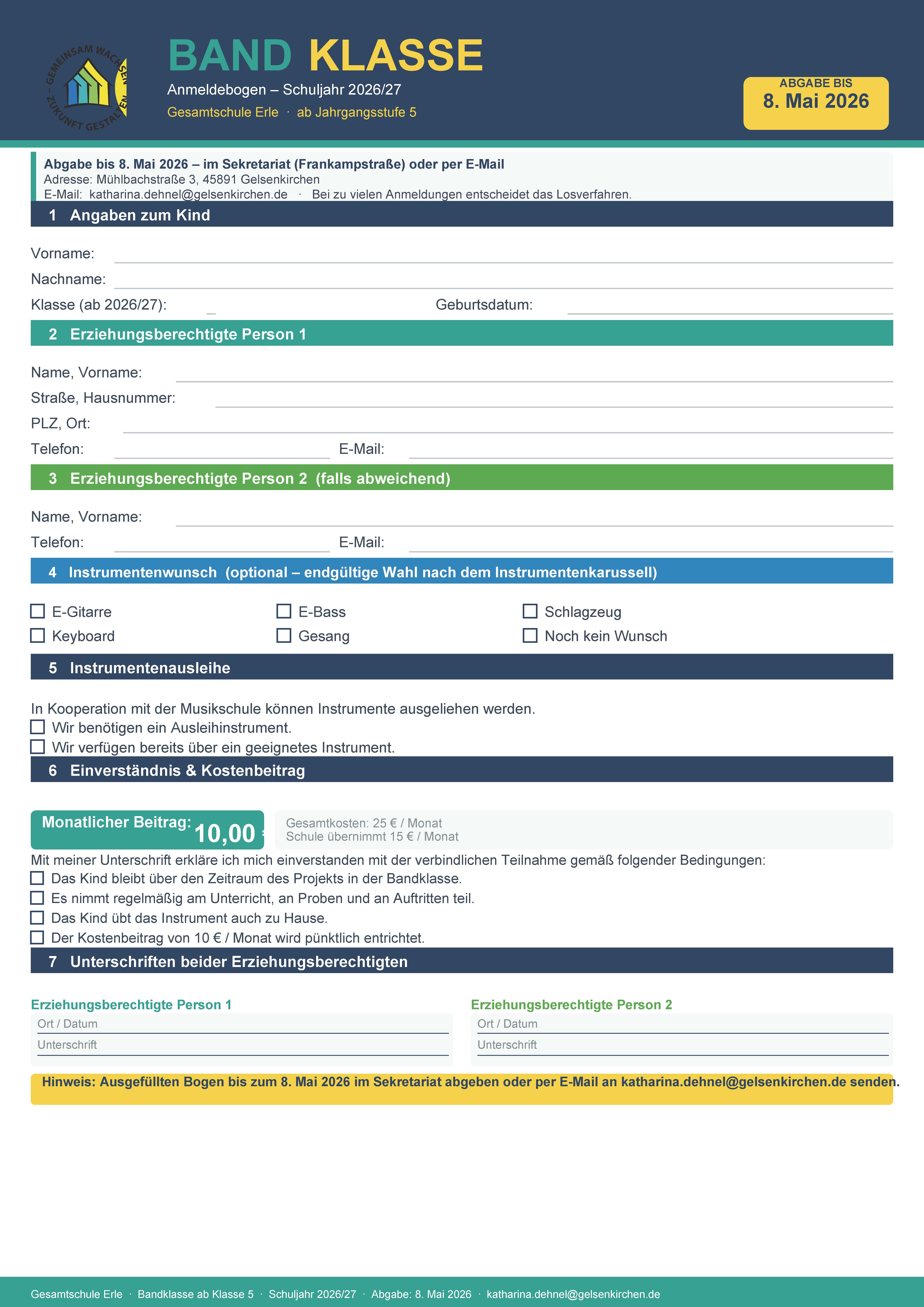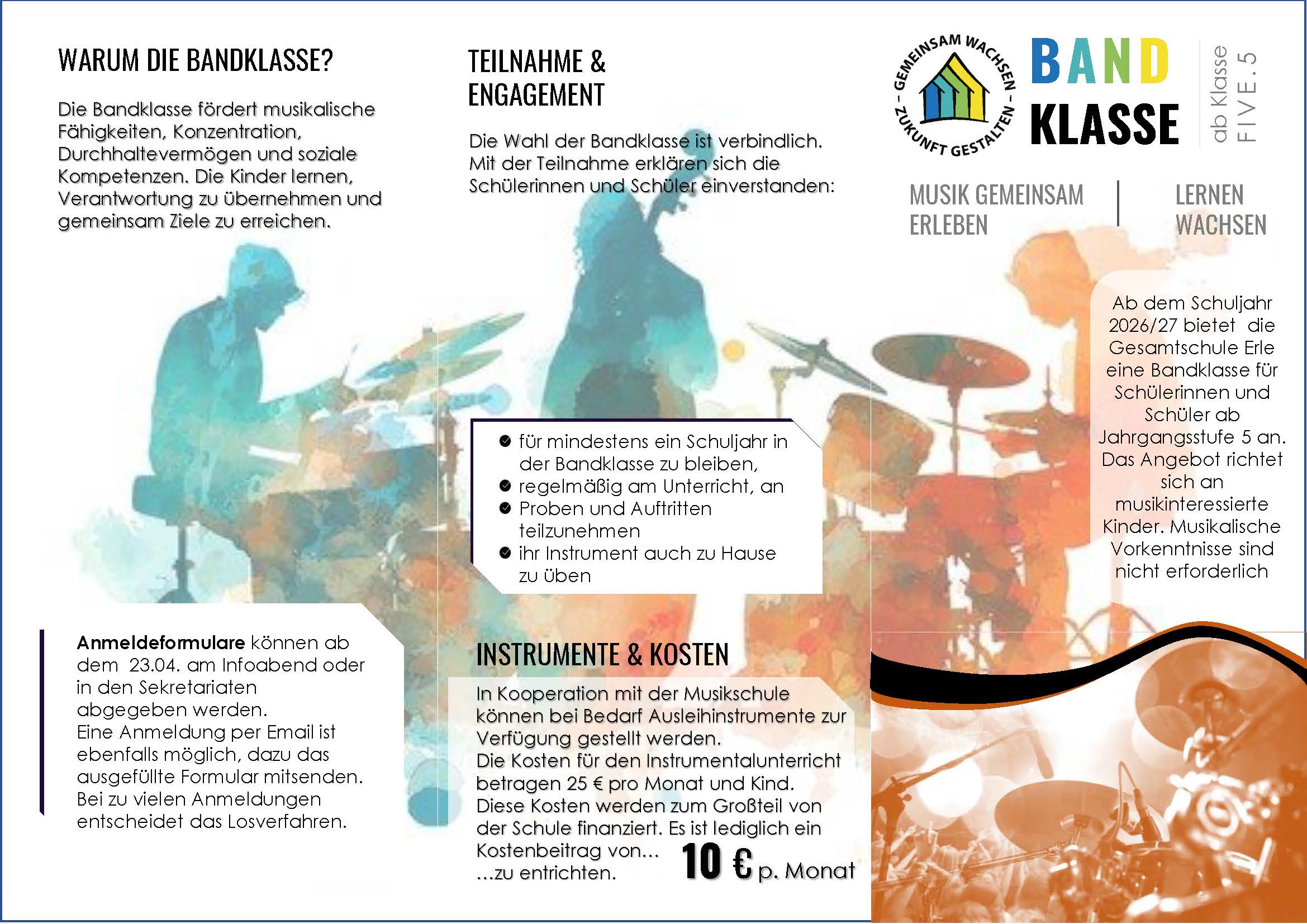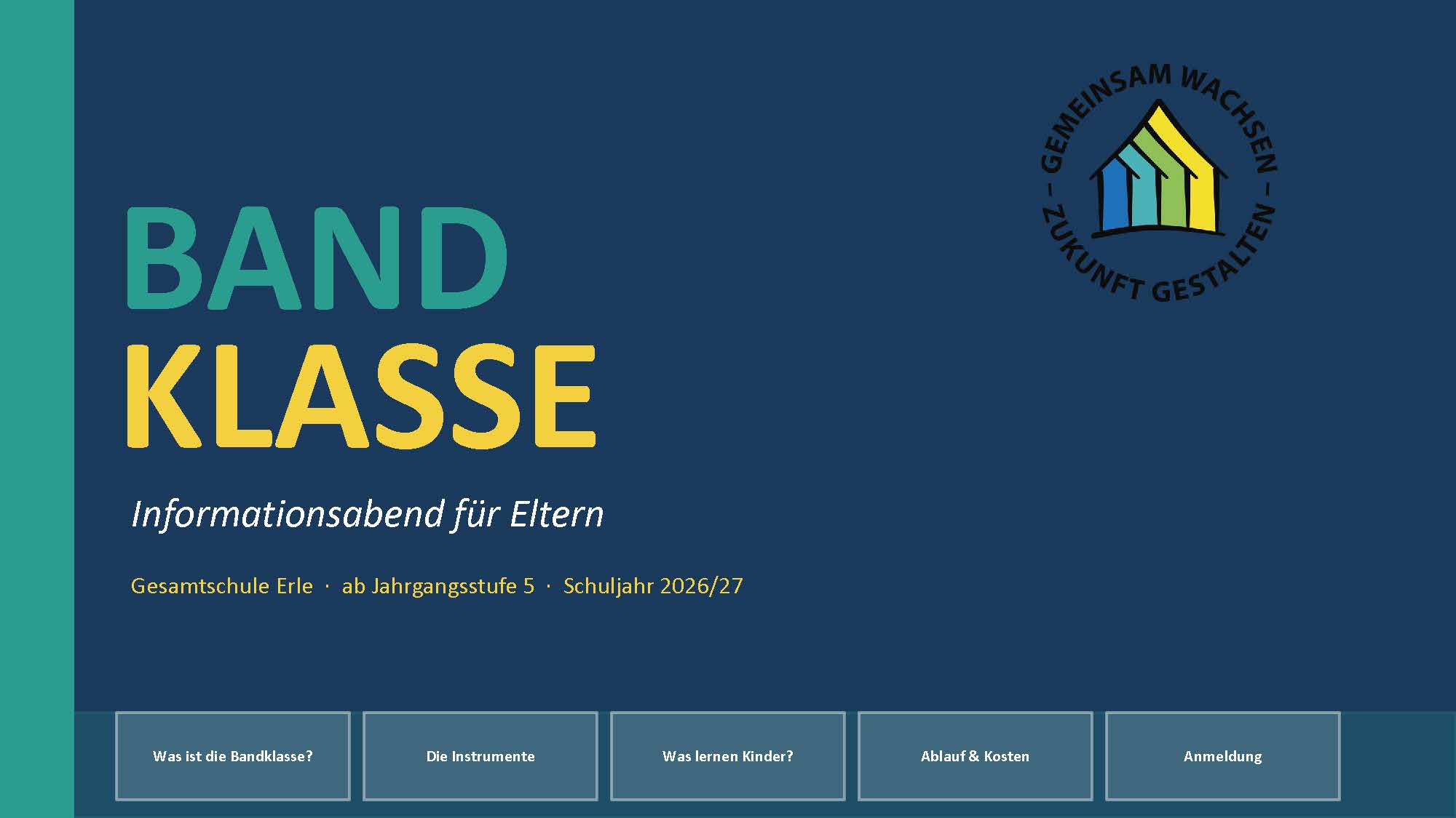 Ab dem Schuljahr 2026/27 bietet die Gesamtschule Erle in Kooperation mit der Musikschule erstmals eine Bandklasse für die Jahrgangsstufe 5 an. In dieser Klasse lernen die Schülerinnen und Schüler von Anfang an, gemeinsam als Band zu musizieren und ihre musikalischen Fähigkeiten im Zusammenspiel zu entwickeln.