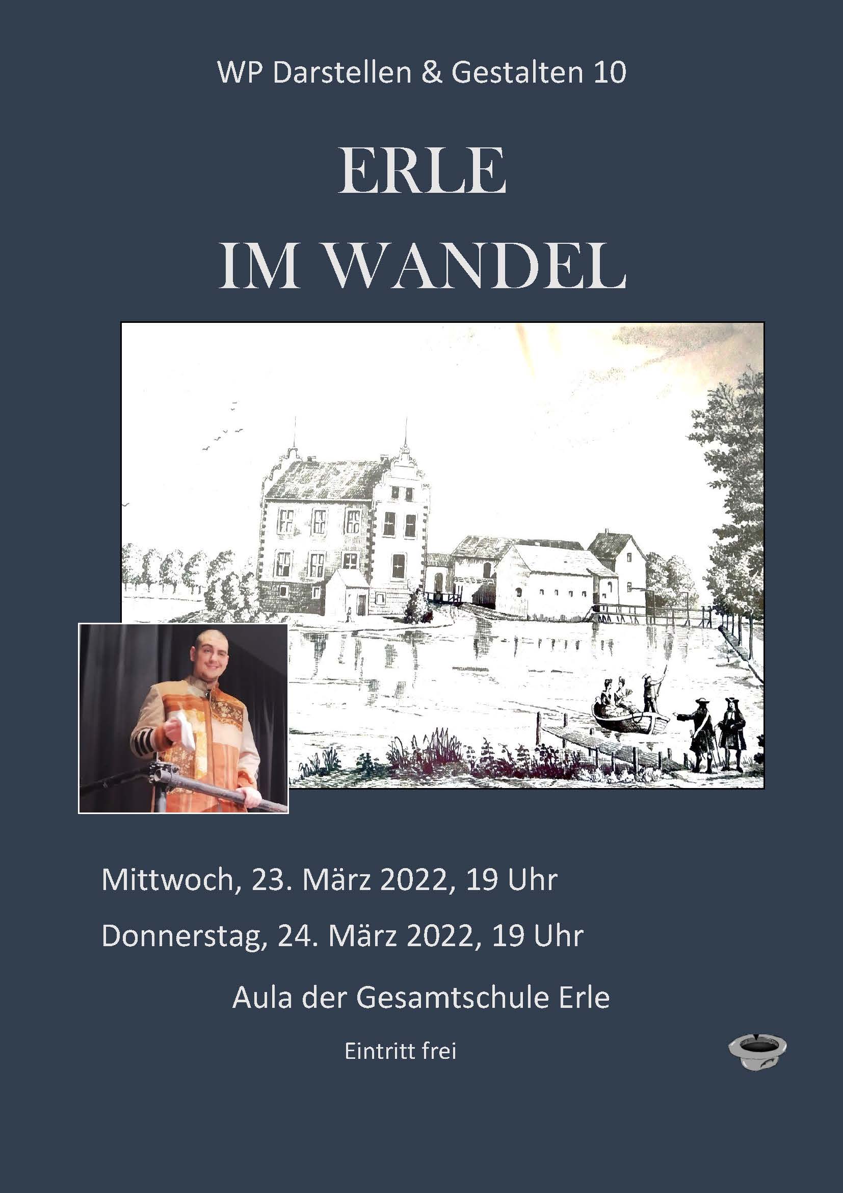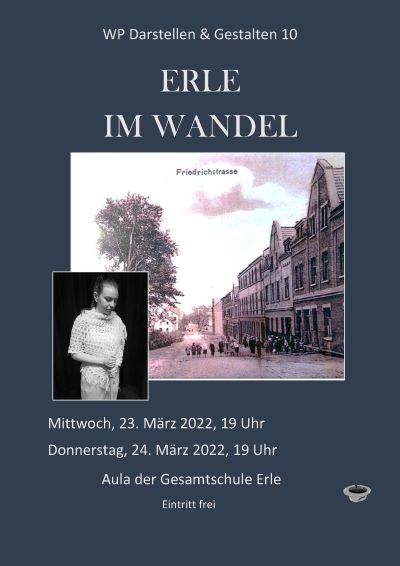 Dies ist der Auftakt für ein spannendes, die Geschichte des Stadtteils „Erle“ erzählenden Theaterstück, welches unter dem Titel „Erle im Wandel“ am 23. und 24. März 2022 in der Aula der Gesamtschule Erle von den Schülerinnen und Schülern des 10. Jahrgangs des Wahlpflichtkurses „Darstellen und Gestalten“ aufgeführt wird. In unterschiedlichen Szenen wird die abwechslungsreiche und spannende Geschichte des Stadtteils – ausgehend von bäuerlichen Strukturen im 18. Jahrhundert, über die wilden 1950er Jahre bis hin zu den ersten Zechenschließungen – erzählt und dabei verdeutlicht, wie unterschiedlich die Menschen in Erle in den vergangenen Jahrhunderten gelebt haben.