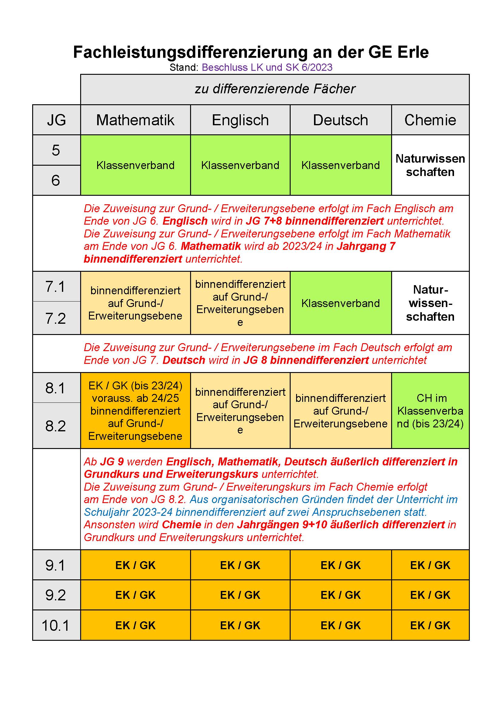 An der Gesamtschule Erle findet der Unterricht in den Fächern Englisch, Mathematik (ab Klasse 7), Deutsch (ab Klasse 8) und Chemie (ab Klasse 9) fachleistungsdifferenziert statt, d.h. die Schüler*innen werden je nach Leistung auf der Grundebene bzw. der Erweiterungsebene unterrichtet.